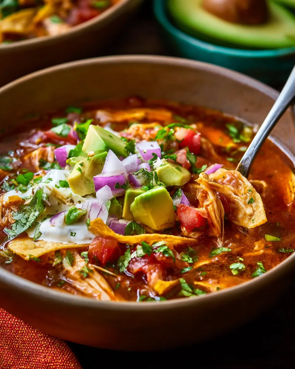 Ladle the soup into bowls and don’t forget to top it with your favorite garnishes like sour cream, diced avocado, or cilantro. Enjoy your warm, hearty Chicken Tortilla Soup—it’s bound to become a favorite!