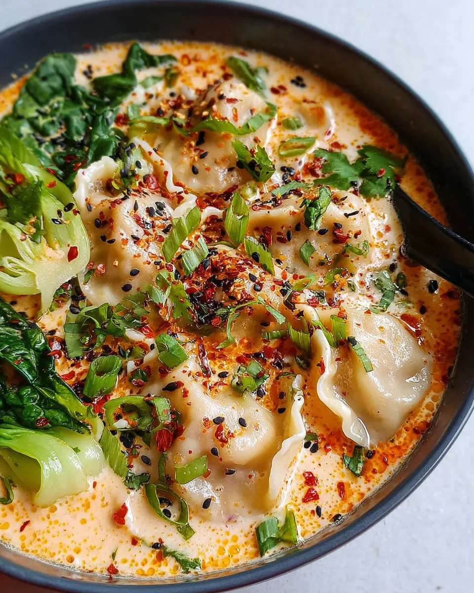 Now comes the best part! Carefully portion the Coconut Curry Dumpling Soup into four bowls, ensuring each bowl gets a fair share of dumplings, bok choy, and that heavenly broth. Top it off with your choice of garnishes—sliced chili pepper, sesame seeds, fresh cilantro, and a drizzle of chili oil. For an even heartier meal, consider adding a generous scoop of cooked jasmine rice.