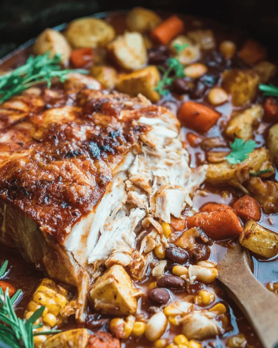 Once you have everything ready, it’s time to bring it all together by combining the ingredients in your slow cooker. Start with the black beans, pinto beans, corn, diced tomatoes, and salsa. Don’t forget to sprinkle in that flavorful taco seasoning. Adding the chicken broth will help everything meld beautifully. Nestle the chicken into the mixture, ensuring it’s fully submerged under the liquid—this is key for keeping the chicken moist and flavorful as it cooks.