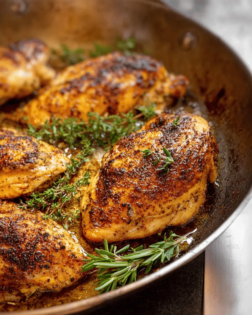 After flipping, add a tablespoon of unsalted butter to the skillet. As the butter melts, let it pool around the chicken, and use a spoon to baste the chicken with this herby, buttery goodness. This extra step adds richness and flavor, taking your pan-seared chicken from delicious to absolutely irresistible. Continue cooking until the internal temperature reaches about 160°F (71°C) for perfectly juicy chicken.
