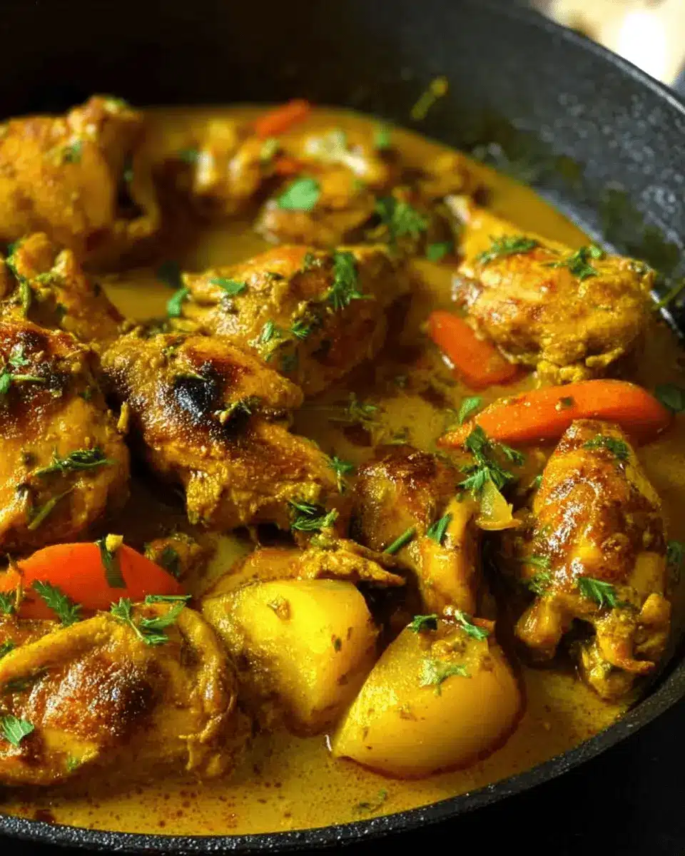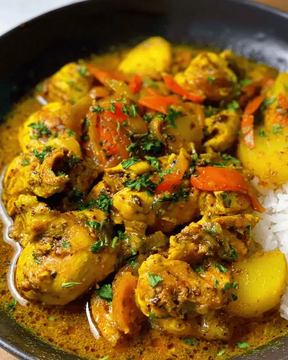 Once your chicken is browned, it’s time to elevate your dish with vegetables. Toss in the chopped carrots, diced potatoes, and fresh thyme. These ingredients not only add texture and flavor but also make the dish a hearty meal. Pour enough boiling water or coconut milk into the pot to cover the chicken. Now, cover the pot and let it simmer for about 25 to 30 minutes. Keep an eye on it, stirring occasionally, until the chicken is cooked through and the sauce thickens into a rich, flavorful curry gravy.