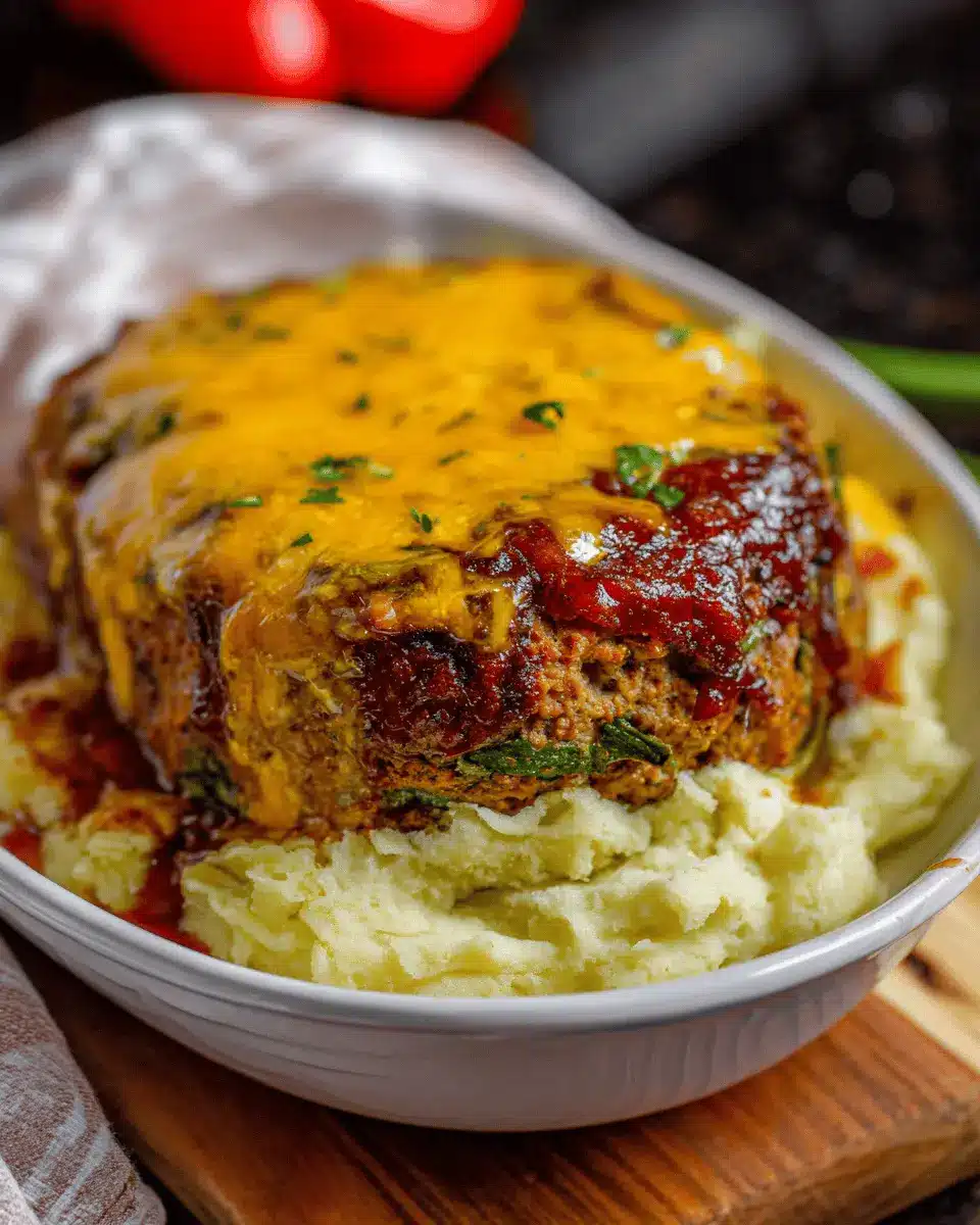 For an eye-catching presentation, serve the meatloaf with mashed potatoes and cheese on a large, rustic platter. Add a sprinkle of chopped parsley for a pop of color. You can slice the meatloaf into thick, hearty slices and arrange them with a generous scoop of cheesy mashed potatoes beside each slice, ensuring the dish looks as good as it tastes! Consider using unique serving dishes to elevate your meal’s overall vibe.