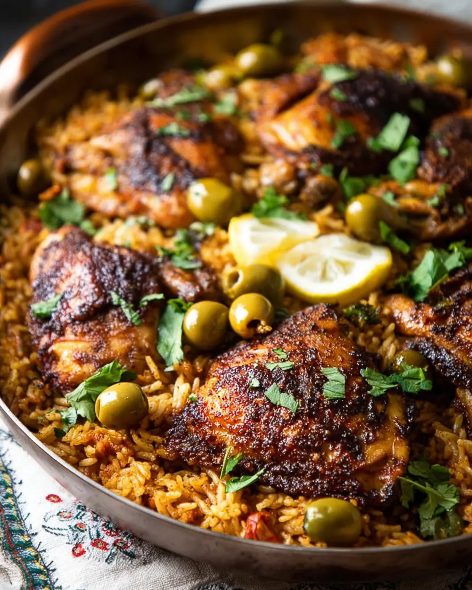 Afterward, remove the lid, stir in the juice of 1 lemon, place your chicken on top of the rice, and add in some green olives for an extra burst of flavor. Cover again and let it cook for another 10 minutes. This last step allows the chicken to absorb all those aromatic flavors, resulting in an unforgettable Moroccan-inspired meal.