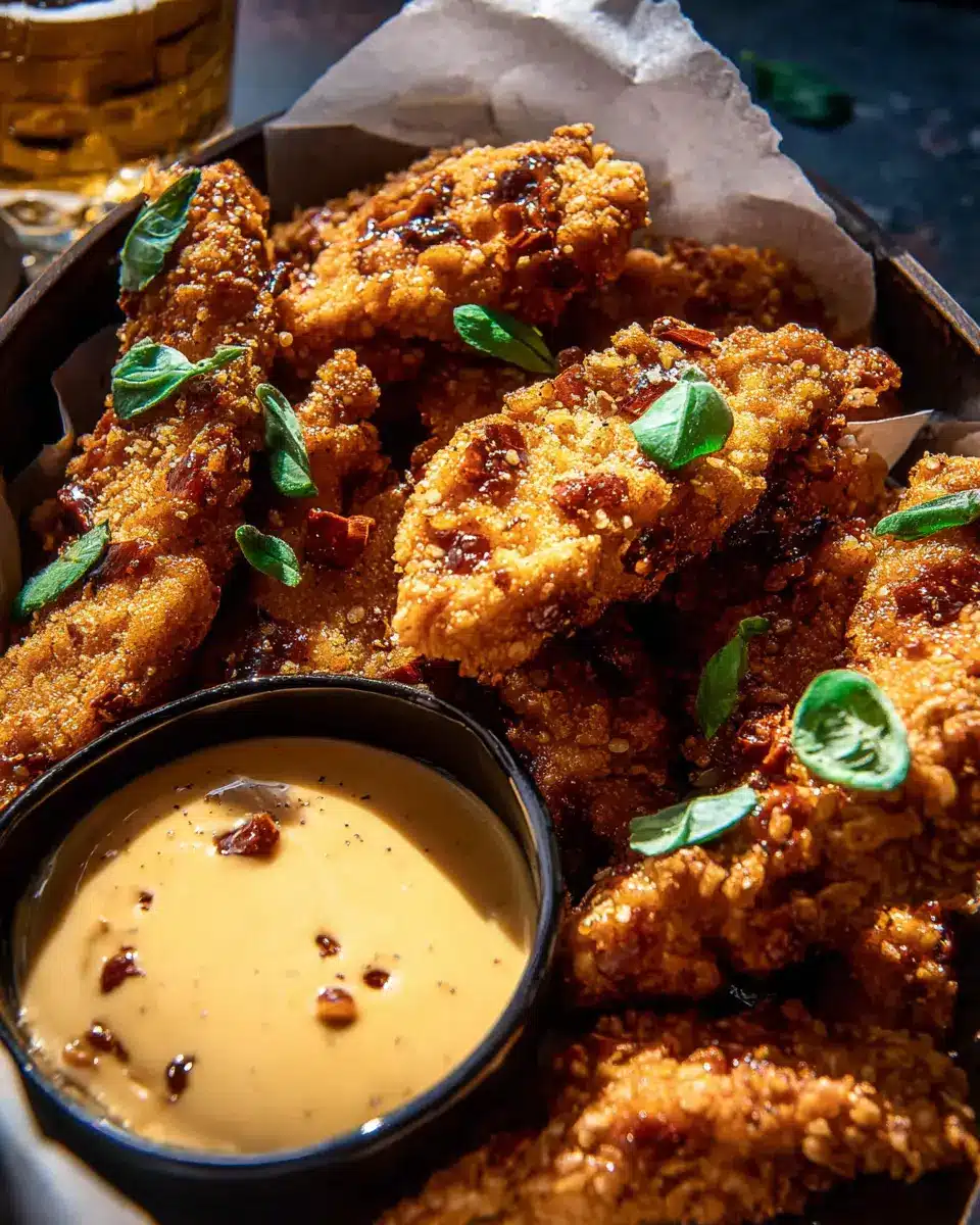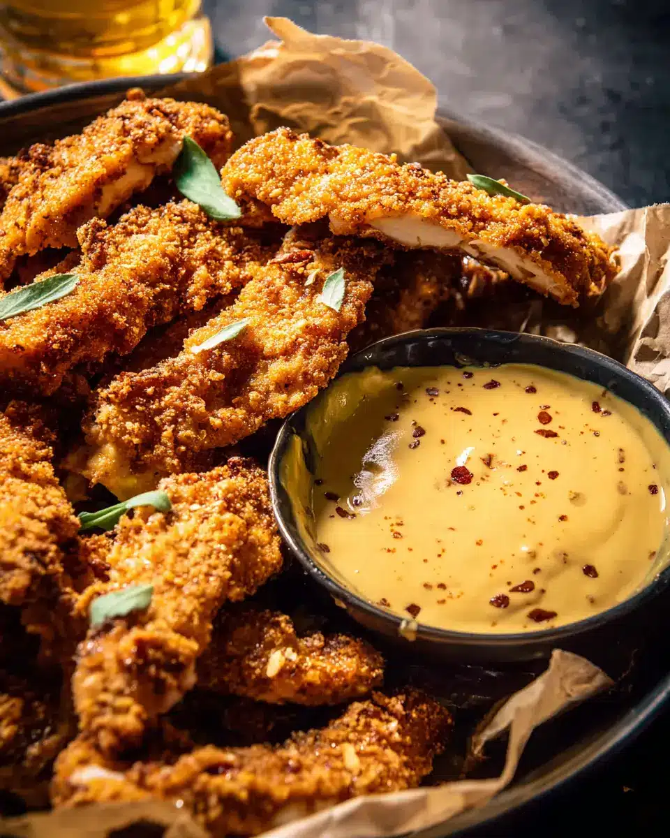 Presentation can take your meal to the next level! Serve your pretzel chicken fingers on a rustic wooden board, along with small bowls of the spicy honey mustard sauce for dipping. Add a sprinkle of fresh herbs around the board for a pop of color. You can also serve them in individual cups for easy grabbing during those nail-biting moments of the game!