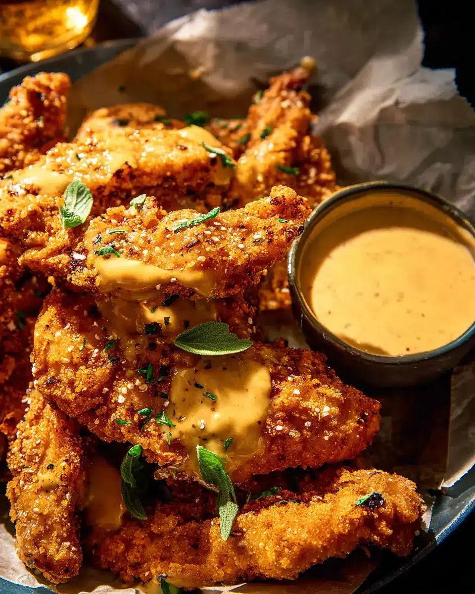 Once your chicken fingers are out of the oven and beautifully crispy, it’s time to serve! Arrange them on a plate and don't hold back—serve them with a generous amount of warm honey mustard cheese sauce for dipping. You'll delight everyone at the table, making this an unforgettable dish for game day or a fun family dinner. Enjoy the crispy goodness!
