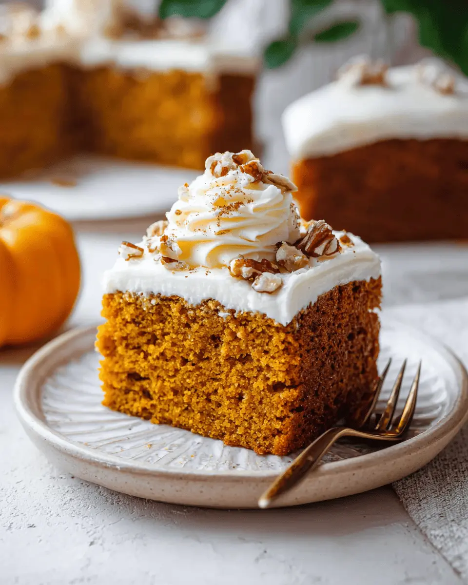 Elevate the pumpkin cake experience through thoughtful presentation. A simple yet elegant way to serve is by using a decorative cake stand. Dust the frosting with a sprinkle of cinnamon or arrange some toasted pecans around the edges for a rustic appeal. For an extra touch, consider adding edible flowers or a drizzle of caramel sauce on the plate. Place a seasonal decorative element like small pumpkins or autumn leaves to set the mood for your gathering.