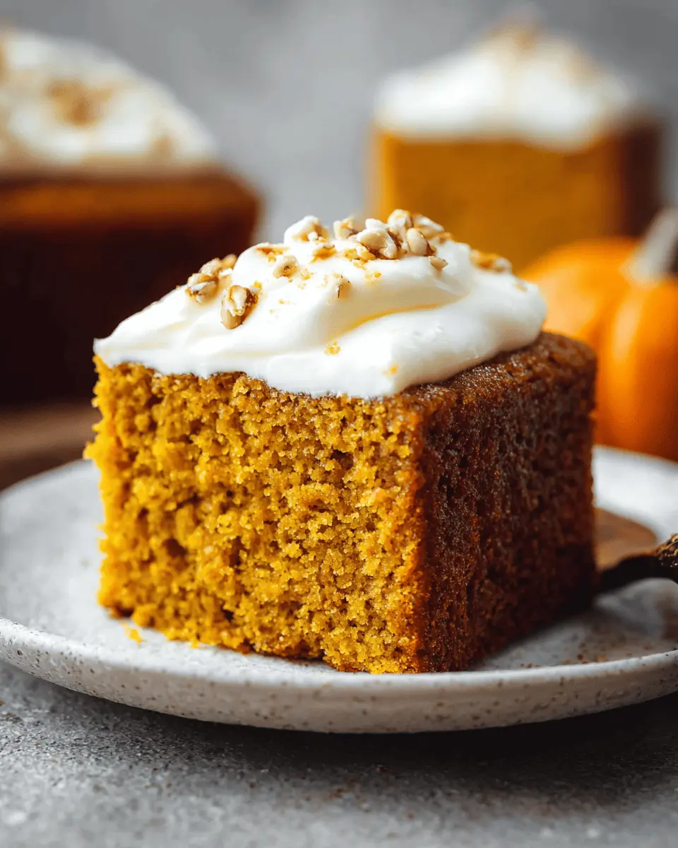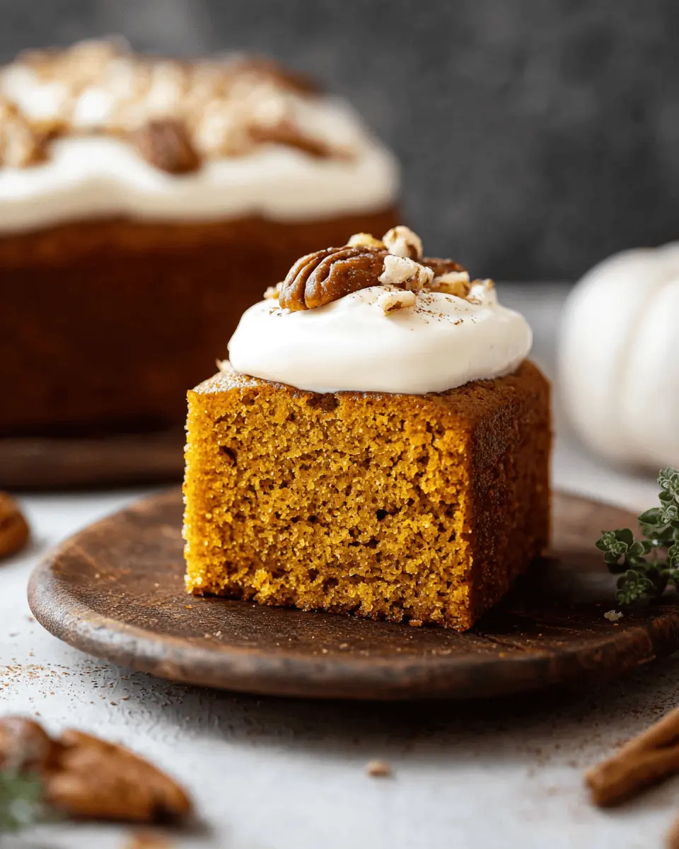 Once your pumpkin cake is fully cooled, it’s time to frost! Whether you frost it while in the pan or after removing it is up to you. Spread your creamy frosting evenly, and if you like, sprinkle some chopped nuts on top for a delightful crunch. Slice it up and serve!