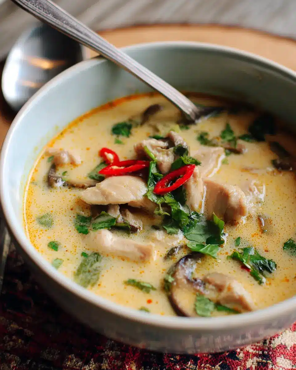 When the chicken is ready, it’s time for the grand finale! Remove the pot from heat and stir in the remaining fish sauce, 3 tablespoons of lime juice, and ¼ cup of chopped cilantro (or scallions, if you prefer). Taste and adjust with salt if needed. Ladle your Tom Kha Gai into bowls, and serve it up solo or alongside fluffy jasmine rice for that extra comfort factor. Your fragrant Thai adventure is now complete, and your taste buds will thank you!
